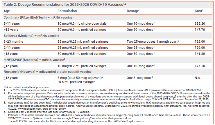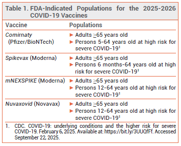 The FDA has licensed new 2025-2026 formulations of the mRNA COVID-19 vaccines manufactured by Pfizer/BioNTech (Comirnaty) and Moderna (Spikevax, mNEXSPIKE1) and the adjuvanted protein subunit COVID-19 vaccine manufactured by Novavax (Nuvaxovid). The new formulations are indicated for use in all adults ≥65 years old and in persons 6 months (Spikevax), 5 years (Comirnaty), or 12 years (mNEXSPIKE, Nuvaxovid) through 64 years old who are at high risk for severe COVID-19 because of an underlying condition.2 An Emergency Use Authorization allowing administration of the Pfizer vaccine to children 6 months through 4 years old has been withdrawn.