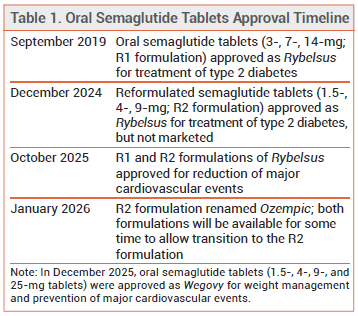 Oral semaglutide 1.5-, 4-, and 9-mg tablets, which were previously approved by the FDA (but never marketed) as the R2 formulation of Rybelsus, have now been approved as Ozempic (see Table 1). Both the original R1 formulation of Rybelsus (3-, 7-, and 14-mg tablets) and the renamed Ozempic tablets are FDA-approved for treatment of type 2 diabetes and to reduce the risk of major adverse cardiovascular events (MACE) in adults with type 2 diabetes who are at risk for these events.1,2 The R1 (Rybelsus) and R2 (Ozempic) formulations are not interchangeable on a mg-per-mg basis; Ozempic tablets contain inactive ingredients that enhance drug absorption and have greater bioavailability than Rybelsus R1 tablets.
