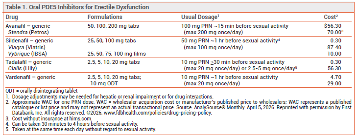 STANDARD TREATMENT — Oral PDE5 inhibitors (see Table 1) are generally used for initial treatment of ED. A nonmedicated, alcohol-based topical gel (Eroxon) is authorized by the FDA for sale over the counter for treatment of erectile dysfunction in men ≥22 years old.1 Other treatment options include vacuum-assisted erection devices, intraurethral or intracavernosal alprostadil, and penile implants.2 Low-intensity extracorporeal shockwave therapy (not approved by the FDA) has gained popularity for treatment of ED, but quality evidence demonstrating its long-term effectiveness is lacking.3