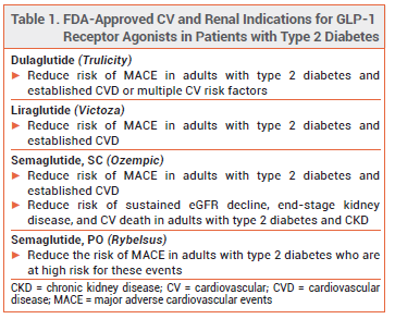 The oral glucagon-like peptide-1 (GLP-1) receptor agonist semaglutide (Rybelsus – Novo Nordisk), which was approved by the FDA in 2019 for treatment of type 2 diabetes in adults, has now also been approved to reduce the risk of major adverse cardiovascular events (MACE) in adults with type 2 diabetes who are at high risk for these events.1 The injectable GLP-1 receptor agonists semaglutide (Ozempic), dulaglutide (Trulicity), and liraglutide (Victoza) are also approved for cardiovascular risk reduction in patients with type 2 diabetes (see Table 1).2